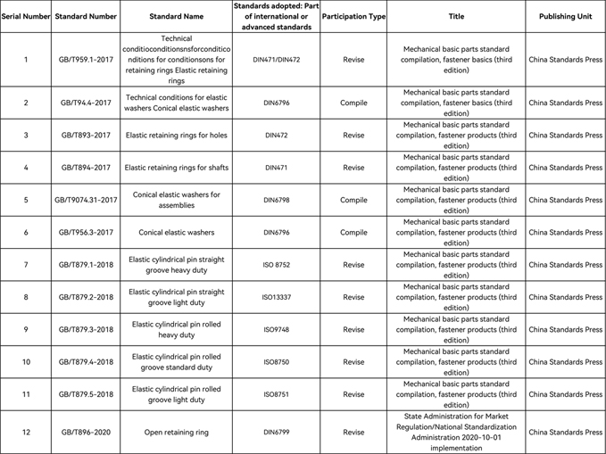 Dongbo Company, standartlaştırma için Ulusal Teknik Komite'nin birim üyesi olarak görev yaptı. Bağımlar uzun yıllardır ve 5. Ulusal Teknik'in 4. Yıllık Toplantısına ev sahipliği yaptı 2015 yılında bağlantı elemanlarının standardizasyonu komitesi. Art arda liderlik etti veya teknik de dahil olmak üzere 13 ulusal standarın formülasyonuna ve revizyonuna katıldı Elastik tutma halkaları için koşullar, Elastik silindirik pimler ve disk rondelaları.